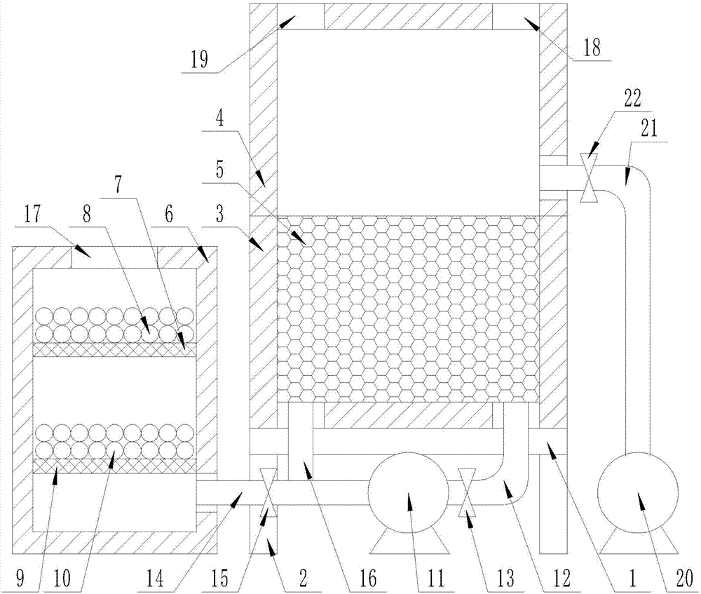 在本實(shí)施方案中,在設(shè)備空閑處設(shè)有HB104控制器,控制器的輸出端與一號電磁閥13、二號電磁閥15、三號電磁閥22、一號引風(fēng)機(jī)11、二號引風(fēng)機(jī)20的輸入端均通過導(dǎo)線相連接,將設(shè)備連接電源,通過控制控制器控制二號電磁閥15、一號引風(fēng)機(jī)11打開,一號電磁閥13、三號電磁閥22、二號引風(fēng)機(jī)20關(guān)閉,從廢氣廢氣進(jìn)氣口17進(jìn)入矩形箱體6,經(jīng)過一號網(wǎng)格擋板7上的脫氮劑8祛除廢氣中的氮,經(jīng)過二號網(wǎng)格擋板9上的脫硫劑10祛除廢氣中的硫;脫硫劑10、脫氮劑8能夠與化肥廠合作提取合成化肥,利用率提高;在一號引風(fēng)機(jī)11的作用下通過二號管道14、三號管道16進(jìn)入U形槽3,經(jīng)過陶瓷蓄熱體5進(jìn)入到倒U形槽4,倒U形槽4內(nèi)通過燃料入口18加入燃料,通過進(jìn)風(fēng)口19加入氧氣,將廢氣加熱到700-900攝氏度使廢氣中的VOC在氧化分解成二氧化碳和水,氧化產(chǎn)生的高溫氣體流經(jīng)特制的陶瓷蓄熱體5,使陶瓷蓄熱體5升溫而“蓄熱”,此“蓄熱”用于預(yù)熱后續(xù)進(jìn)入的有機(jī)廢氣,從而節(jié)省廢氣升溫的燃料消耗,可以控制三號電磁閥22、二號引風(fēng)機(jī)20的開關(guān)控制廢氣處理時間,達(dá)到時間后打開三號電磁閥22、二號引風(fēng)機(jī)20,在二號引風(fēng)機(jī)20的作用下將處理后的廢氣排出;也可以控制一號電磁閥13、一號引風(fēng)機(jī)11打開,二號電磁閥15、三號電磁閥22關(guān)閉,將廢氣循環(huán)引入U形槽3、倒U形槽4內(nèi),可循環(huán)處理,多次處理后廢氣分解效率達(dá)到99%以上,節(jié)約空間、節(jié)省投資費(fèi)用。